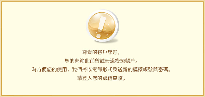 盡管模擬交易賬戶模擬了正式的交易平台賬戶的大多數情況,由於其不具備對市場清算能力,您仍可能遇到一些在交易細則上的不同。如欲了解更多,請與我們客服聯系。